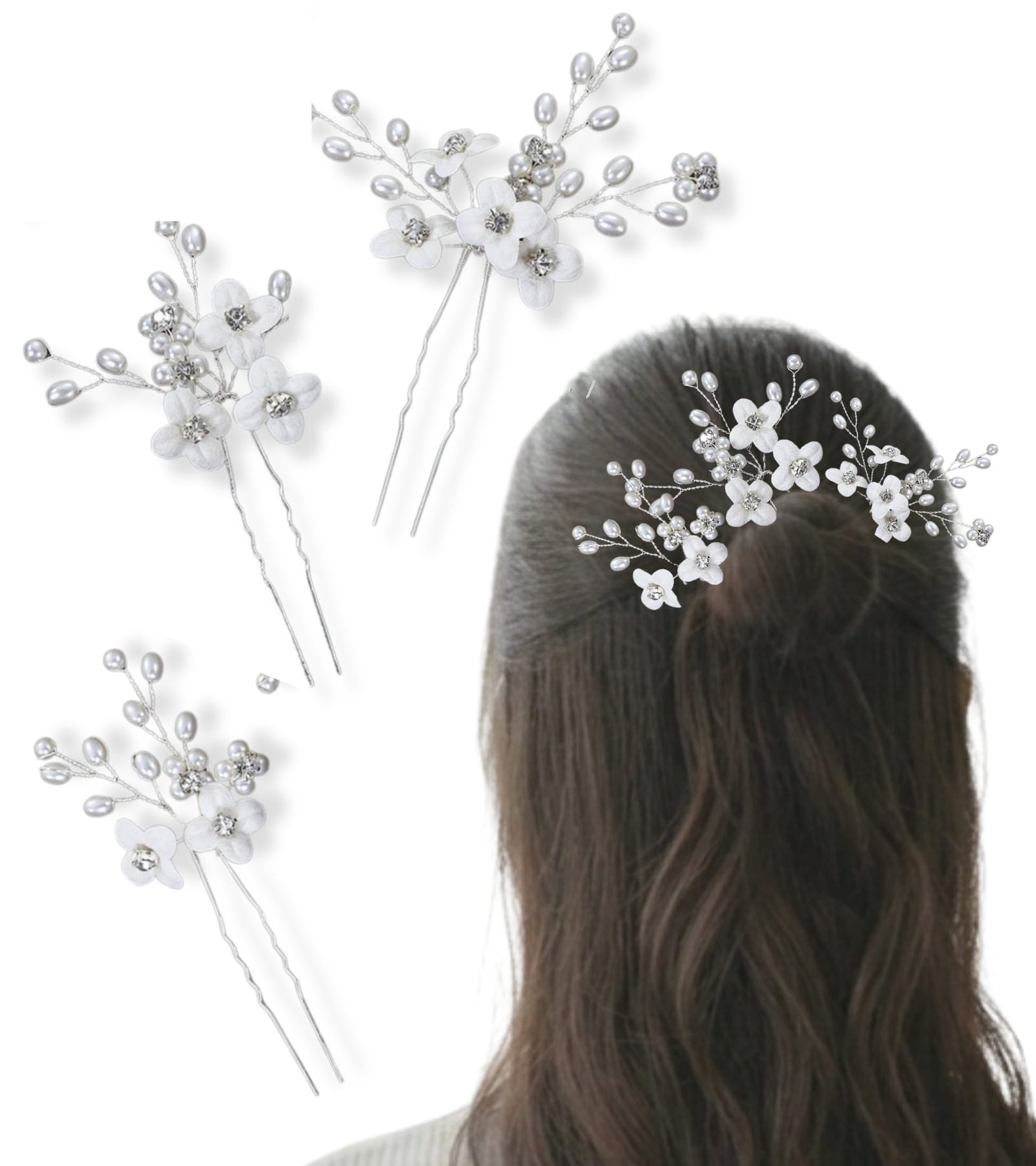 上品な白いフラワーモチーフと、繊細なビーズを組み合わせた、温かみのある髪飾り3点セット。